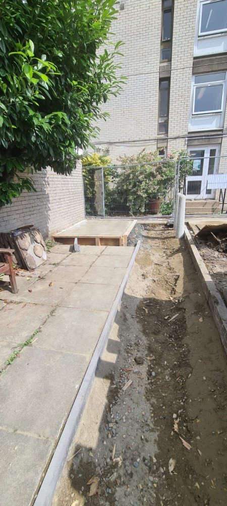 Reduce level dig and install Type 1 aggregate, timber formwork, reinforcement mesh and pour concrete base for air compressor unit. Before returning once cured to strike timber formwork.