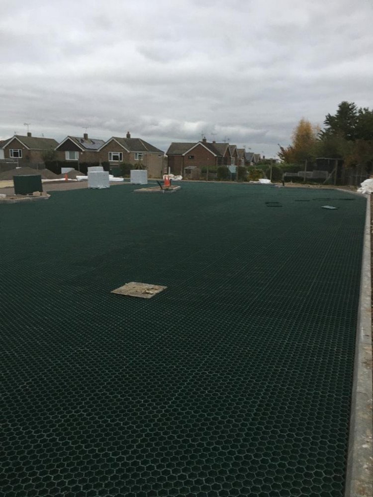 Supply and lay Golpla Reinforcement Grids on 2/6mm aggregate, infilled with 20mm Granite Chippings.